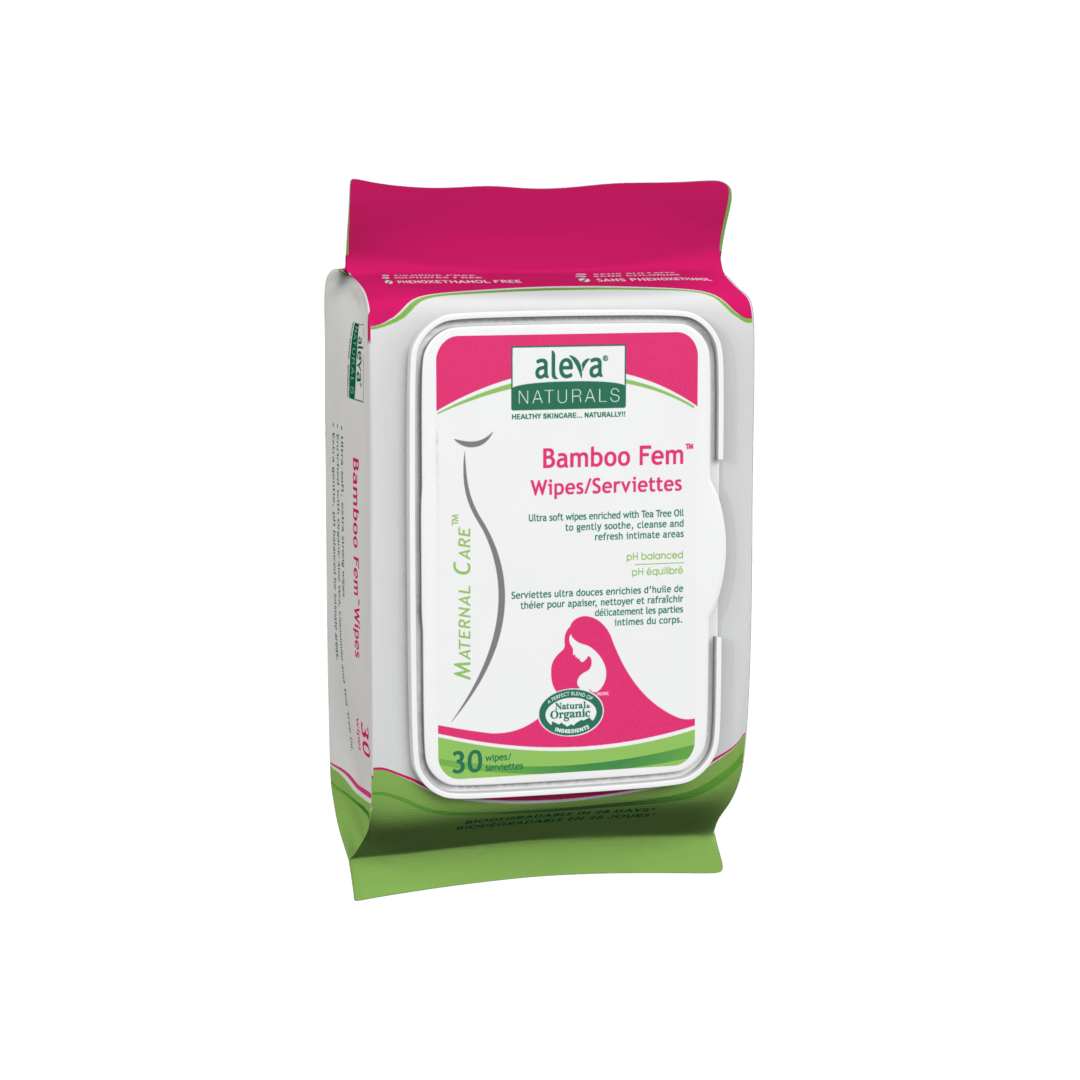 En tant que mères, nous sommes toujours en déplacement, mais nous voulons aussi nous sentir propre et à notre meilleur. Cependant, ce n’est jamais facile d’accomplir tout cela en une seule étape. C’est pour cette raison que nous avons créé les serviettes Bamboo Fem - Des serviettes spécifiquement conçues pour être très douces, même sur les peaux les plus sensibles. Les serviettes Bamboo Fem d’Aleva Naturals sont ultra-douces et enrichies en huiles biologiques d'aloès vera, de camomille et d'arbre à thé qui apaisent, nettoient et rafraîchissent vos parties intimes. Ces serviettes sont idéales pendant et après la grossesse, et même lorsque vous faites face à une très forte sensibilité. Nous vous recommandons d'utiliser ces lingettes dans le cadre de vos habitudes quotidiennes d’hygiène.