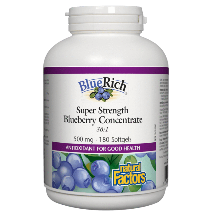 Les bleuets sont excellents pour la vue, ralentissent le vieillissement prématuré et le déclin cognitif et aident à éviter les infections urinaires, grâce aux anthocyanines, ces antioxydants à haute valeur CARO (capacité d’absorption des radicaux libres de l’oxygène) qu’ils contiennent. BlueRich de Natural Factors est un concentré 36:1 ultra-fort, obtenu à partir de bleuets entiers cultivés au Canada. Il fournit le spectre complet des nutriments du bleuet. Renforce la vision, réduit la fatigue oculaire et aide à protéger contre les rétinopathies et la dégénérescence maculaire liée à l’âge Améliore la mémoire et les fonctions cognitives Lutte contre les radicaux libres qui contribuent au vieillissement prématuré Favorise le maintien de bons taux de cholestérol et d’une bonne tension artérielle Contribue à la prévention des infections urinaires