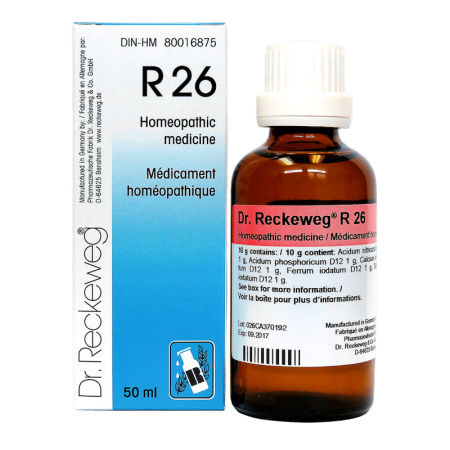 Basée sur les recherches originales du Dr Heinrich Reckeweg et fabriquée selon des normes de contrôle de qualité rigoureuses en Allemagne, la formule R26 contient une combinaison bien équilibrée d'Acidium nitricum D12, de Calcium iodatum D12, de Ferrum iodatum D12, ainsi que d'autres remèdes homéopathiques.