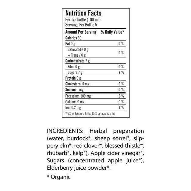 Préparation à base de plantes (eau, gingembre *, bardane *, oseille *, orme glissant *, trèfle rouge *, chardon béni *, rhubarbe *, varech *), vinaigre de cidre *, sucres (jus de pomme concentré *), arôme naturel de citron .