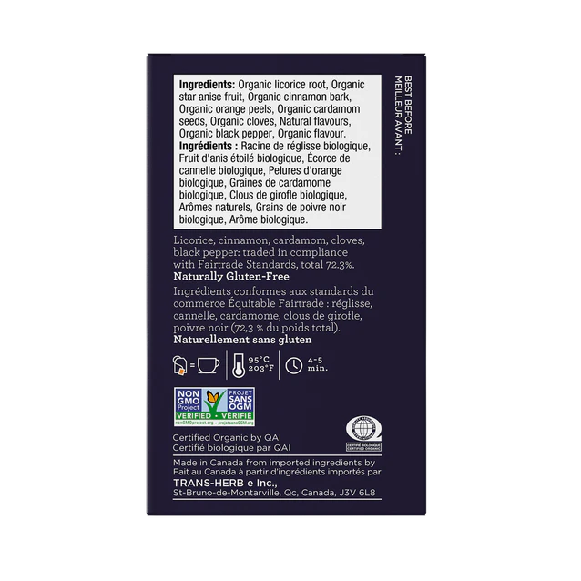 Racine de réglisse biologique, Fruit d'anis étoilé biologique, Écorce de cannelle biologique, Pelures d'orange biologique, Graines de cardamome biologique, Clous de girofle biologique, Arômes naturels, Grains de poivre noir biologique, Arôme biologique.