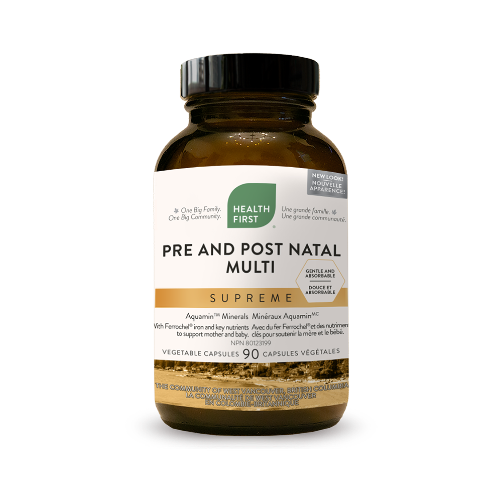 Health First Pre and Post Natal Multi Supreme propose une formule bien équilibrée, douce pour l'estomac, hautement biodisponible, et comprenant des vitamines et minéraux essentiels pour soutenir les femmes en âge de procréer. Formulé avec des vitamines B méthylées, du calcium et du magnésium Aquamin™ hautement absorbables, et du fer bisglycinate Ferrochel®, notre formule aide à garantir une consommation adéquate de calcium et de fer, soutient le développement fœtal précoce, et contribue au maintien d'un métabolisme glucidique sain et d'une fonction immunitaire robuste lorsqu'il est associé à une alimentation équilibrée. Répondez à vos besoins quotidiens avec seulement 2 à 3 capsules par jour !