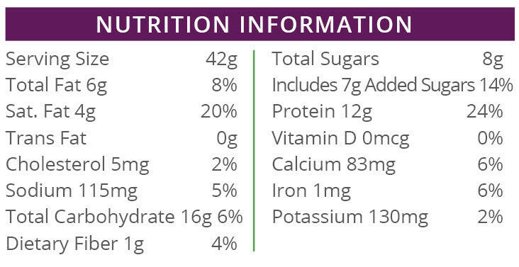 Mélange de protéines (isolat de protéines de lactosérum, concentré de protéines de lactosérum, isolat de protéines de lait, isolat de protéines de soja), Enrobage au beurre d'arachide (sucre, huile de palmiste, farine d'arachide partiellement dégraissée, lait écrémé en poudre, huile d'arachide, sel, lécithine de soja [émulsifiant]), Couche de fraise (sirop de maïs, lait concentré sucré [solides de lait, saccharose], sucre, huile de palmiste, eau, poudre de crème [solides de crème sucrée], beurre [crème, sel], arôme artificiel), Croustillant de protéines de soja (protéines de soja isolées), Glycérine, Eau, Gélatine, Farine d'arachide, Pâte d'arachide (arachides, sel, huile de palme), Arachides, Huile de palmiste, Lécithine de soja (émulsifiant), Sel, Sorbate de potassium (conservateur).