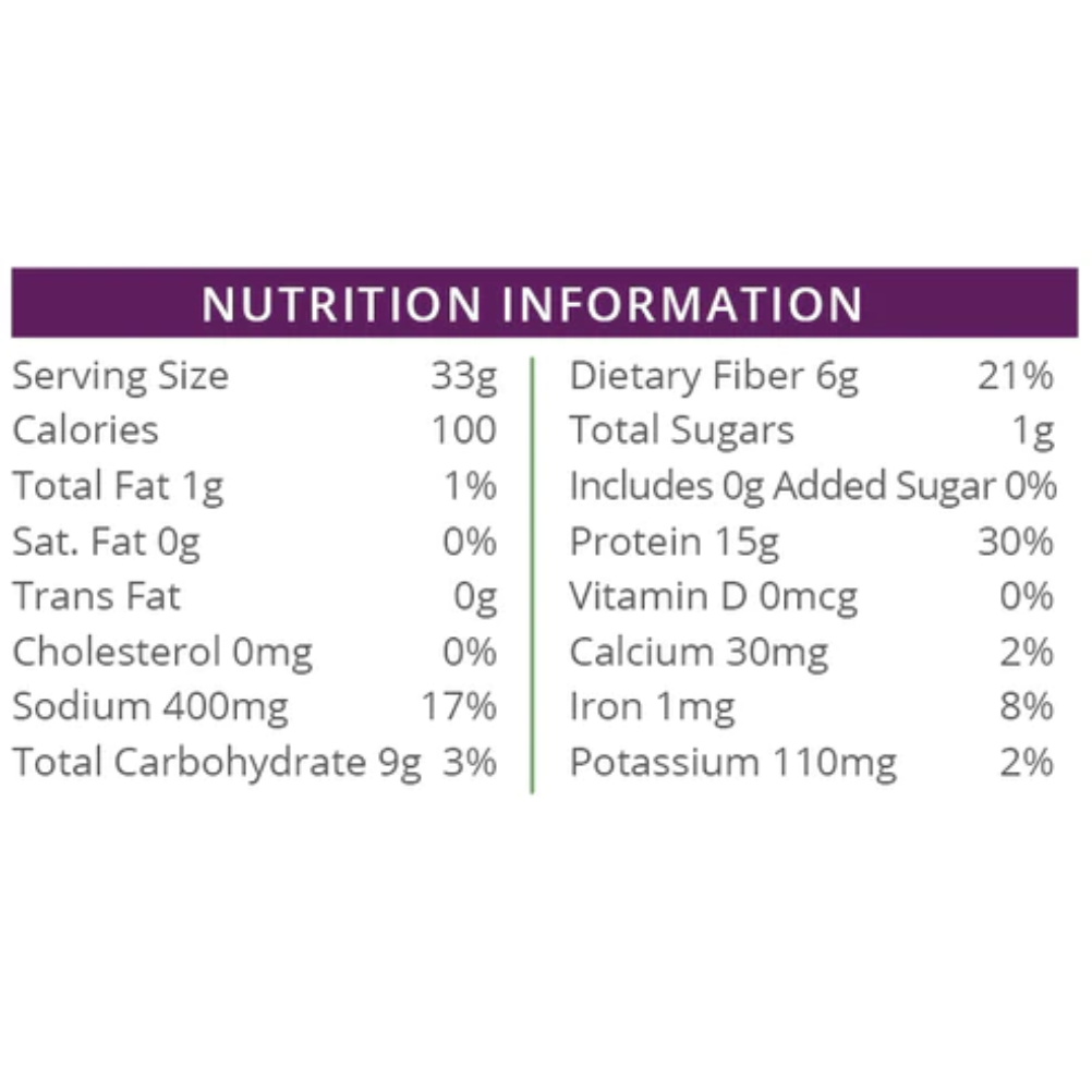 Protéine végétale texturée, haricots rouges, protéines de soja, piment, sel, épices, oignons et ail déshydratés, poudre de tomate, arôme [(protéine de soja hydrolysée, chlorhydrate de thiamine), huile végétale (palme)], poivrons rouges, inosinate disodique et guanylate disodique, acide citrique, mélange de gommes (arabe, xanthane, guar).
