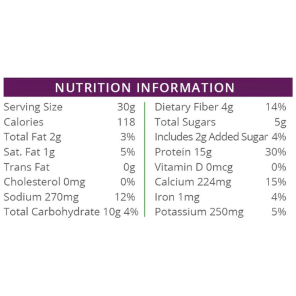 Mélange de protéines (caséinate de calcium, isolat de protéines de lait, concentré de protéines de lactosérum), farine d'arachide, poudre de cacao (traitée avec un alcali), fructose, arômes naturels, lait écrémé, crémier (huile de tournesol, solides de sirop de maïs, caséinate de sodium [un dérivé du lait], mono- et diglycérides, phosphate dipotassique, contient 2 % ou moins de chacun des éléments suivants : phosphate tricalcique, lécithine de soja, tocophérols [ajoutés pour aider à protéger la saveur]), sel, épaississants (gomme de cellulose, gomme xanthane, gomme de guar et alginate de sodium), fibre de racine de chicorée (inuline), fibre de maïs soluble, citrate de potassium, sucralose, phosphate tricalcique, lécithine de tournesol et/ou lécithine de soja.