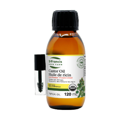 Prenez soin de votre peau, de vos cheveux et de vos ongles avec l'huile de ricin biologique de St. Francis Herb Farm .