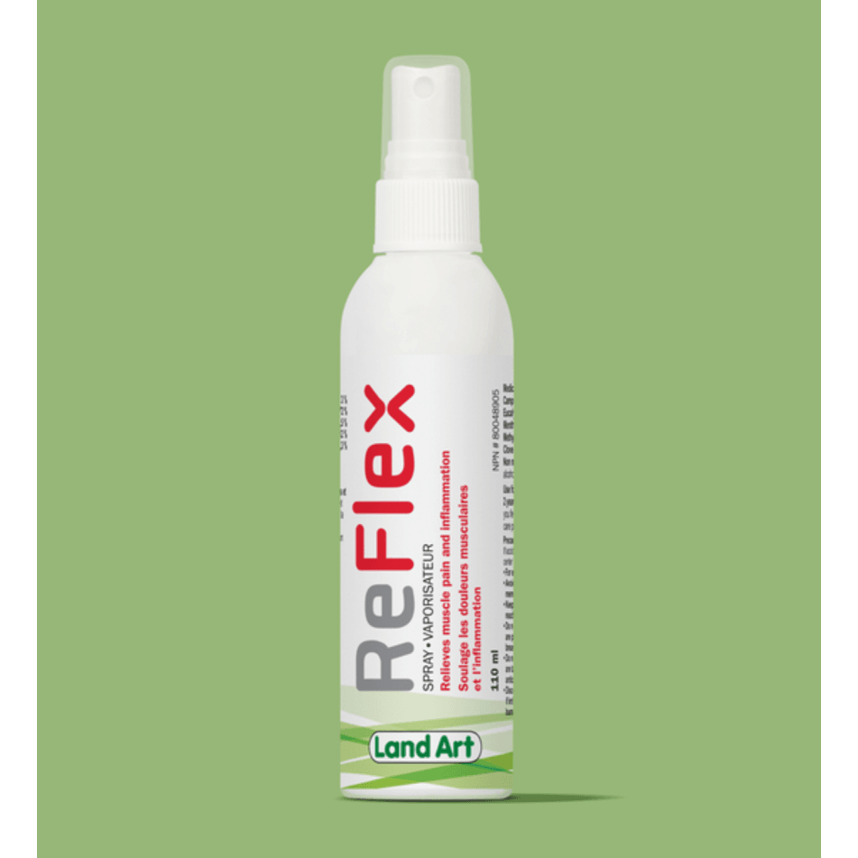 Le vaporisateur ReFlex de Land Art soulage temporairement la douleur et les courbatures des muscles et des articulations. Parmi les ingrédients qui composent le Reflex, on retrouve le camphre ainsi que l'huile essentielle d’eucalyptus et le menthol, qui ont pour rôle de calmer la douleur en l’engourdissant par une sensation de froid et de chaud. De leur côté, le thé des bois réchauffe les muscles endoloris et l’huile de girofle agit en tant qu’analgésiant.