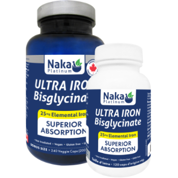 L'Ultra Fer Bisglycinate de Naka Platinum apporte 25 mg de fer élémentaire par capsule pour une meilleure absorption gastro-intestinale. De nombreux compléments en fer peuvent provoquer des effets secondaires gastro-intestinaux, tels que nausées, vomissements, constipation, diarrhée et selles foncées, car ces formes conventionnelles sont mal absorbées.