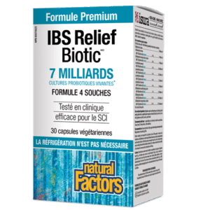 Relief Biotic de Natural Factors est un produit à souches multiples ayant une teneur en probiotiques de 7 milliards d’unités formant la colonie (ufc), notamment des souches LactobacillusBacillus et Enterococcus dont les propriétés d’atténuation de certains symptômes du syndrome du côlon irritable ont été éprouvées. Cette préparation innovante aide aussi à réduire le risque de diarrhée associée aux antibiotiques et elle est conçue pour une longue conservation – sans réfrigération !