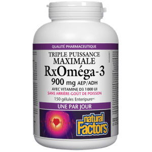 Maximum Triple puissance RxOméga-3 avec vitamine D3 de Natural Factors est l’une des sources les plus concentrées d’acides gras oméga-3 à longue chaîne de types éicosapentaénoïque (AEP) et docosahéxaénoïque (ADH) qui soit et disponible en formule un-par-jour. Ce mélange d’huile de poisson tout à fait unique fournit 600 mg d’AEP et de 300 mg d’ADH avec chaque gélule, soit l’équivalent de l’apport 2:1 utilisé dans une majorité d’études cliniques. Ces oméga-3 sont scientifiquement reconnus pour leurs bienfaits considérables pour la santé cardiovasculaire, la santé cognitive, la fonction cérébrale et pour réduire les douleurs causées par la polyarthrite rhumatoïde. La vitamine D3 est ajoutée pour accroître l'absorption des minéraux et faciliter le développement et l'entretien des os et des dents.