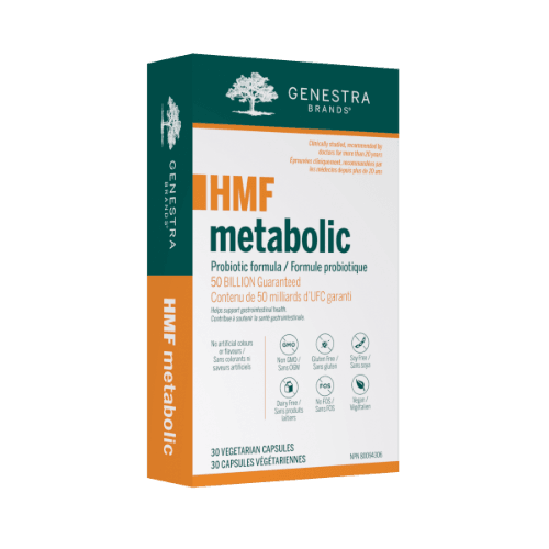 HMF Metabolic de Genestra est un probiotique formulé pour favoriser une gestion saine du poids lorsqu'il est utilisé dans le cadre d'un programme de réduction de l'apport calorique alimentaire et d'augmentation de l'activité physique.
