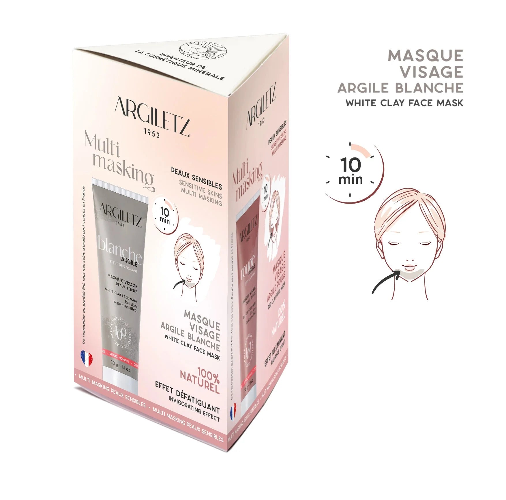 • Argile BLANCHE : L'alliée des peaux délicates. Grâce au kaolin, elle est douce, neutre et convient parfaitement à tous les types de peaux, y compris les plus matures. (Ingrédients : Argile blanche (kaolin), aqua.)