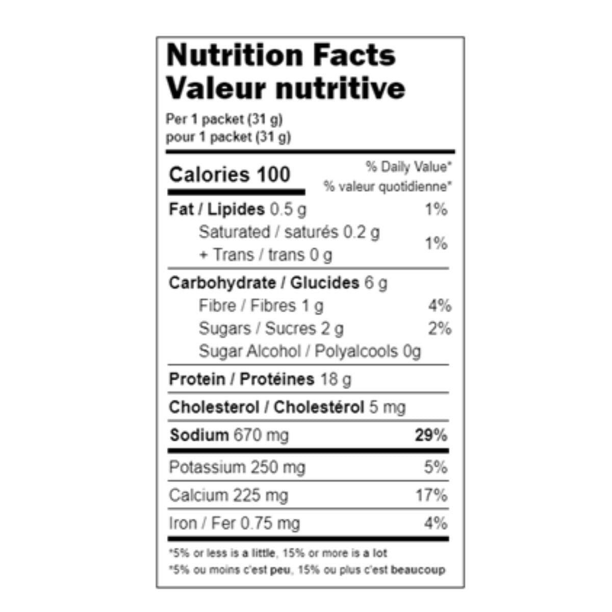 Isolat de protéine de lactosérum, Isolat de protéine de lait, Légumes deshydratés (carotte, pois, maïs, champignon, oignon) (18 %), Protéine de blé texturée (gluten de blé, amidon de blé, pyrophosphate de potassium, carbonate de sodium, tocophérols), Sel de mer, Extrait de levure, Sucres (maltodextrine), Arôme naturel, Herbes de Provence, Poivre noir, Gomme xanthane, Lécithine de tournesol, Dioxyde de silicium.