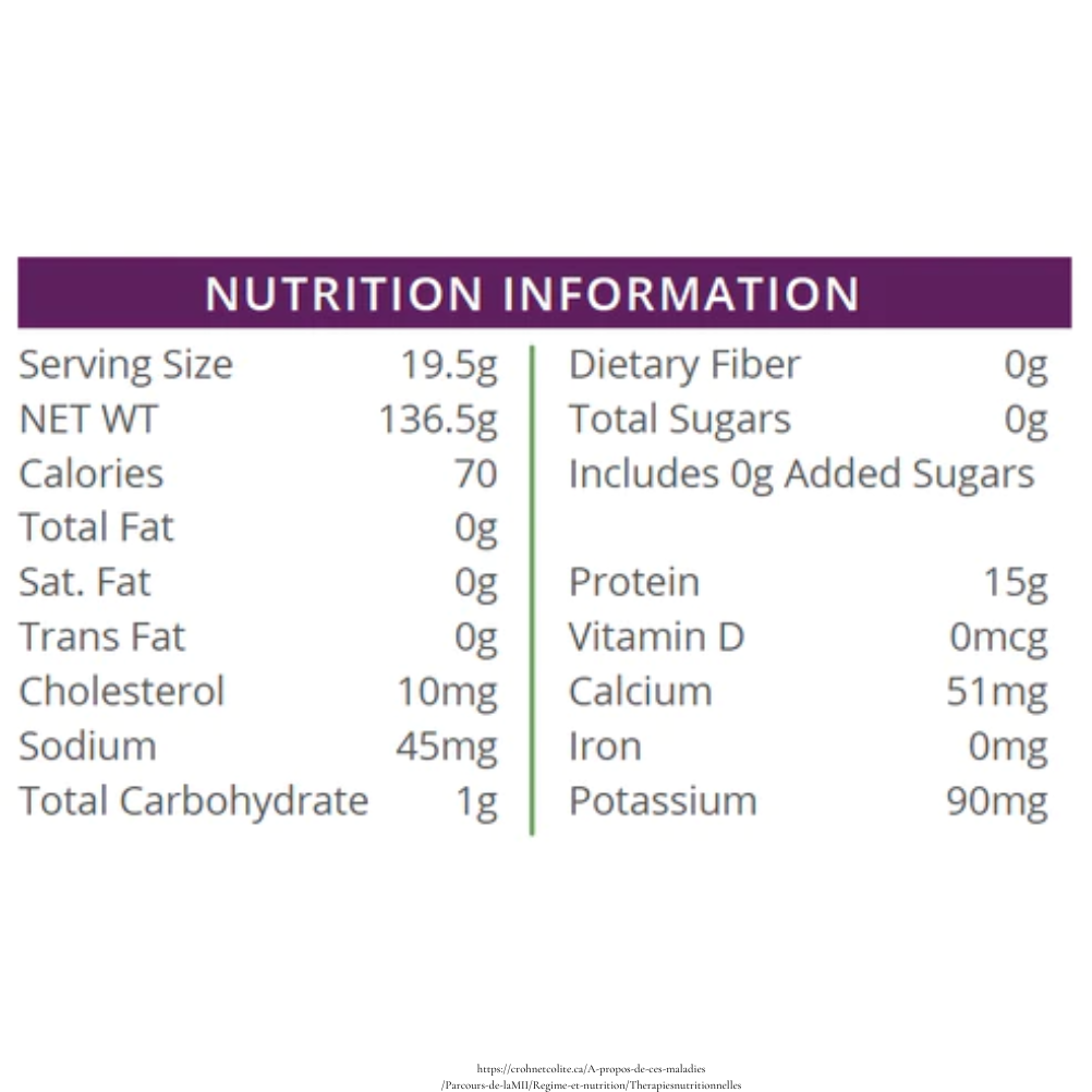Nous nous efforçons de fournir des informations précises sur les produits, mais les fabricants peuvent parfois modifier leurs listes d'ingrédients, ce qui peut entraîner des différences entre les informations affichées sur notre site web et les informations figurant sur l'emballage du produit. Nous vous recommandons de ne pas vous fier uniquement aux informations présentées sur le site et de toujours lire attentivement les étiquettes, les avertissements et les instructions avant d'utiliser ou de consommer un produit. Pour plus d'informations sur un produit, veuillez contacter le fabricant. Les informations fournies sur ce site sont à titre de référence seulement et ne remplacent pas les conseils d'un professionnel de la santé agréé. Vous ne devriez pas utiliser ces informations pour diagnostiquer ou traiter un problème de santé ou une maladie. Contactez immédiatement un professionnel de la santé si vous soupçonnez avoir un problème de santé.