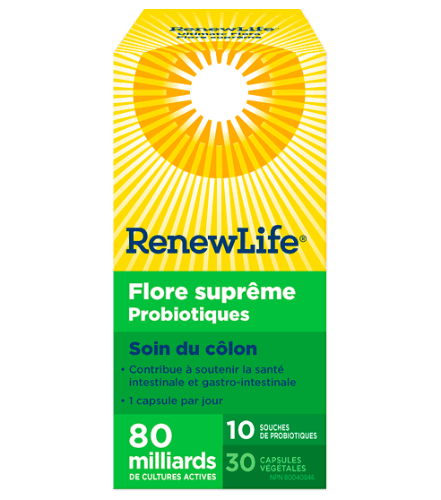 Flore suprême Soins du côlon est une formule qui comporte 80 milliards de cultures provenant de 10 souches de probiotiques, conçue pour le traitement des troubles chroniques de l’intestin grêle et du gros intestin tels que le syndrome du côlon irritable et la colite, ainsi que pour ceux qui souffrent de constipation ou de diarrhée chroniques.