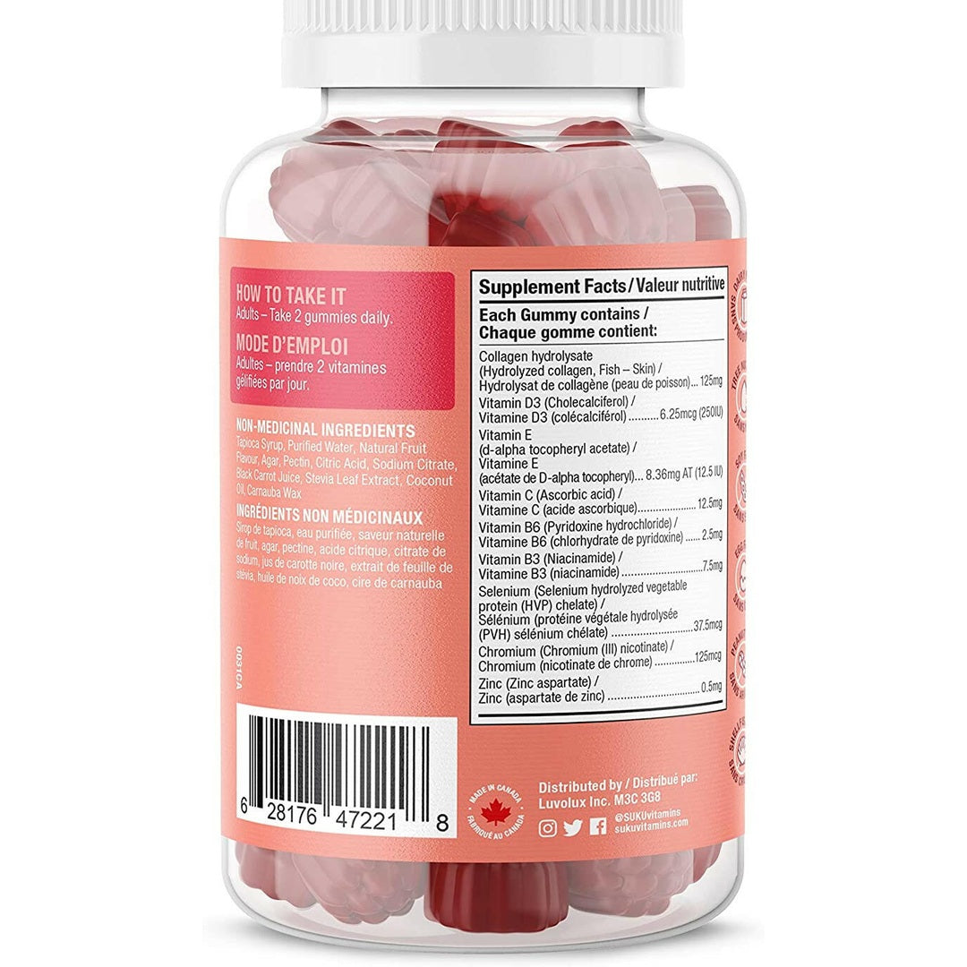 Remplis de collagène marin hydrolysé, ces bonbons gélifiés fournissent une dose suffisante de collagène et de peptides conçus pour aider à maintenir une peau saine. Un mélange de vitamines B6, C, D et E ainsi que de zinc, de sélénium et de chrome soutient également la capacité de la peau à former du tissu conjonctif et aide également le corps à avoir des cheveux plus forts et plus sains.
