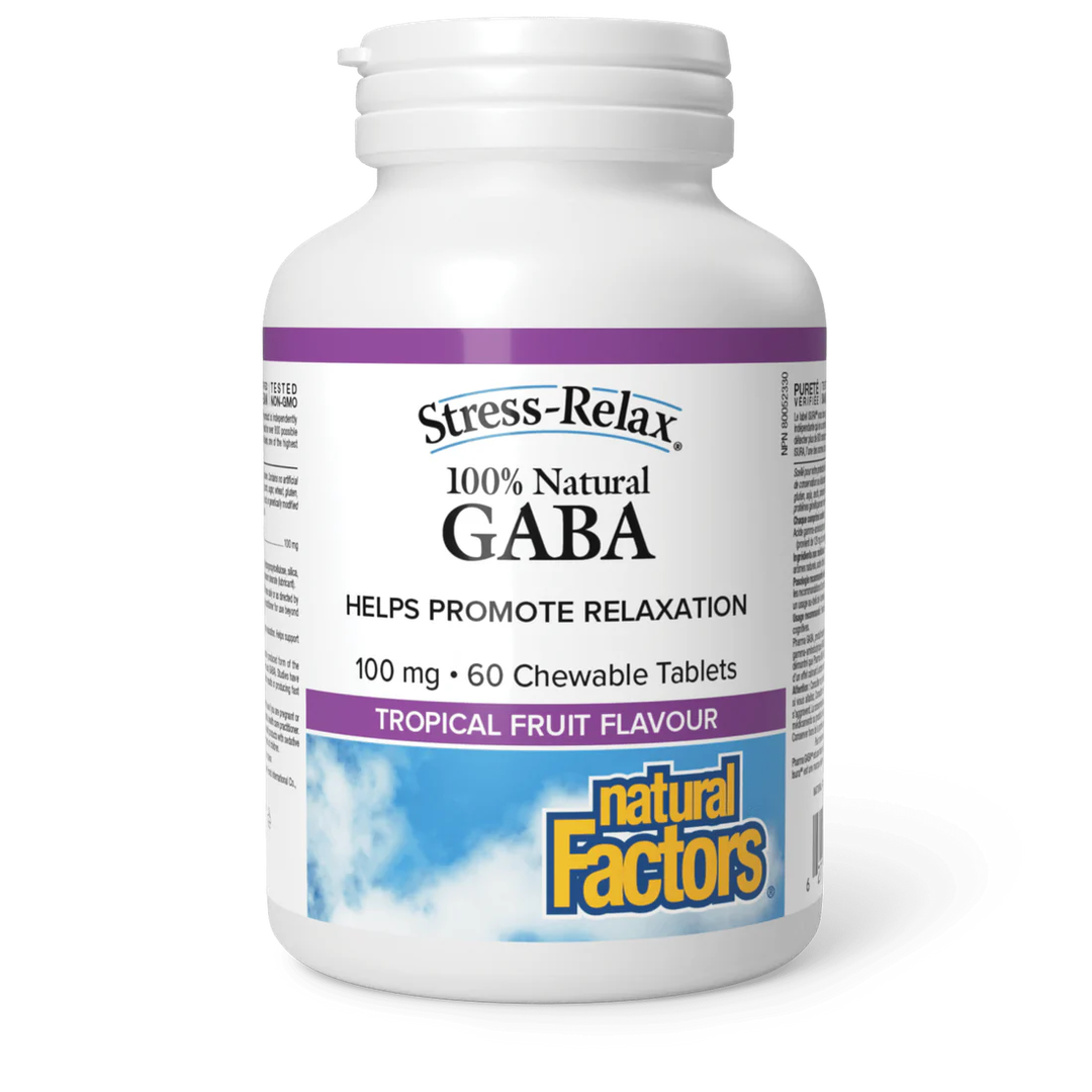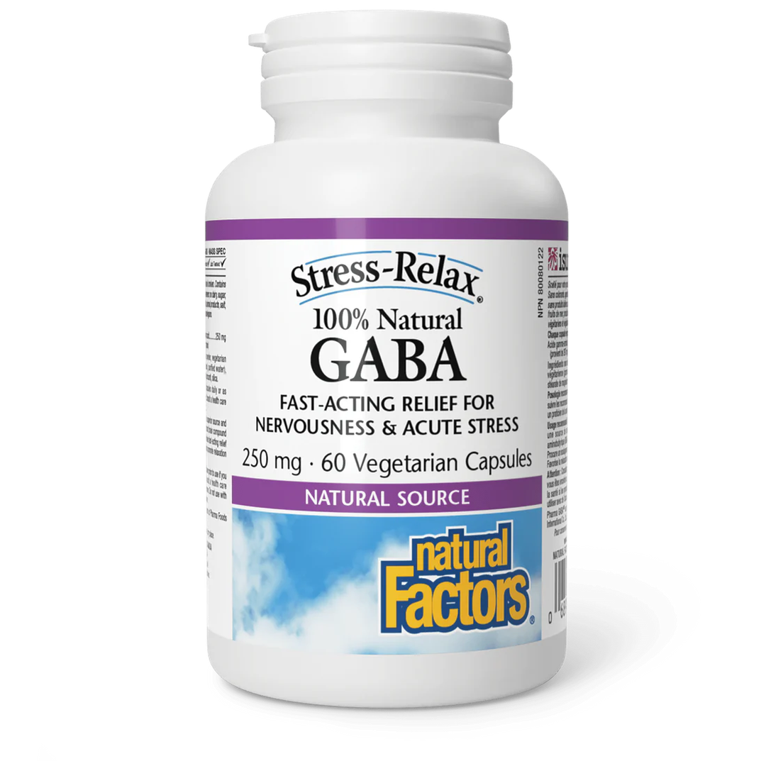 Natural Factors Stress-Relax GABA 100 % naturel est une préparation de source supérieure, produite naturellement, qui soulage rapidement la nervosité et le stress aigu.