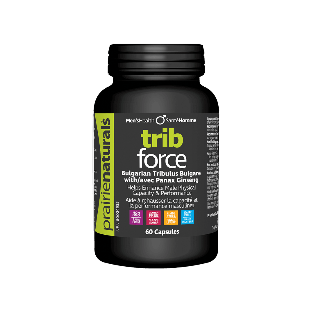Prairie Naturals Trib Force est un mélange de 2 puissants extraits botaniques adaptogènes, tribulus bulgare et panax ginseng. Tribulus terrestris est surtout connu pour sa capacité à promouvoir une libido saine et augmenter l’énergie masculine. Tribulus a un fort effet anti-stress, qui, à son tour, aide à prévenir la conversion excessive de la testostérone en œstrogène. Le stress et l’inflammation sont les deux plus grandes causes de dysfonction érectile, d'un faible taux de testostérone et d'une diminution de l'énergie chez les hommes.