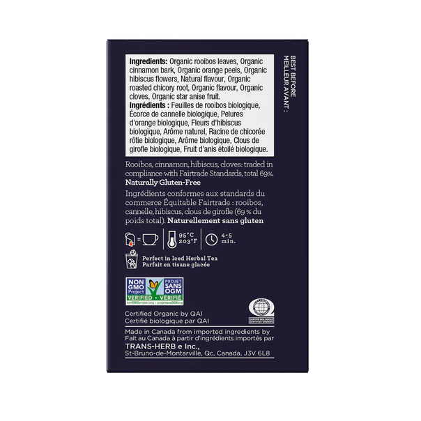Feuilles de rooibos biologique, Écorce de cannelle biologique, Pelures d'orange biologique, Fleurs d'hibiscus biologique, Arôme naturel, Racine de chicorée rôtie biologique, Arôme biologique, Clous de girofle biologique, Fruit d'anis étoilé biologique. Ingrédients conformes aux standards du commerce Équitable Fairtrade : rooibos, cannelle, hibiscus, clous de girofle
