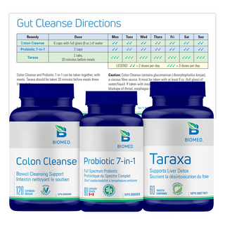 Prenez 2 capsules de Probiotique 7-en-1 et 6 capsules de Colon Cleanse avec 8 oz d'eau deux fois par jour. À un moment différent, prenez 2 comprimés de Taraxa trois fois par jour. Ou selon les directives d'un professionnel de la santé.