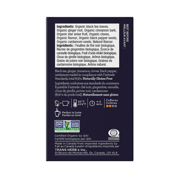 Feuilles de thé noir biologique, Racine de gingembre biologique, Écorce de cannelle biologique, Fruit d'anis étoilé biologique, Clous de girofle biologique, Arôme biologique, Grains de poivre noir biologique, Graines de cardamome biologique, Arôme naturel.