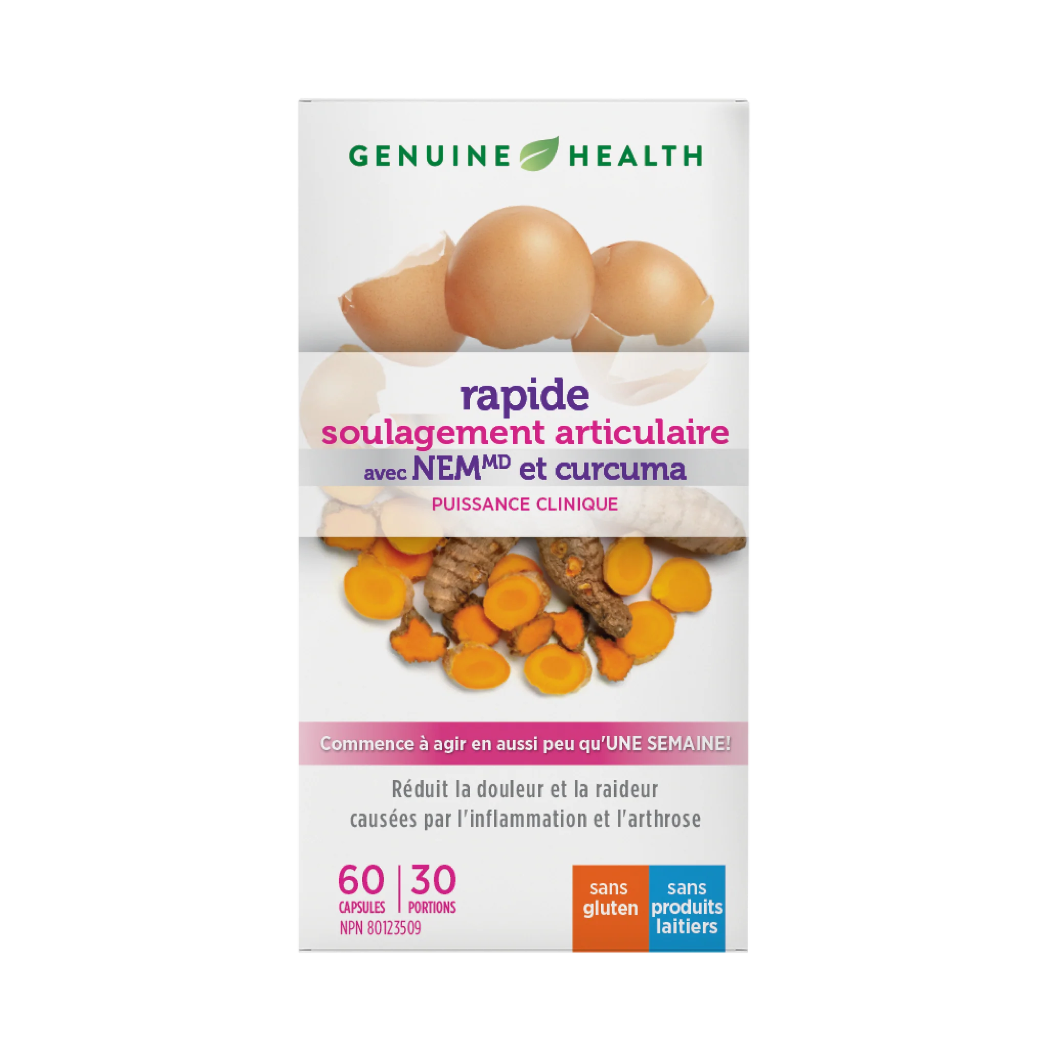 - 500 mg de NEMMD (membrane entièrement naturelle de coquille d'œuf écoresponsable), ainsi que du curcuma fermenté et de l'extrait de curcuma.