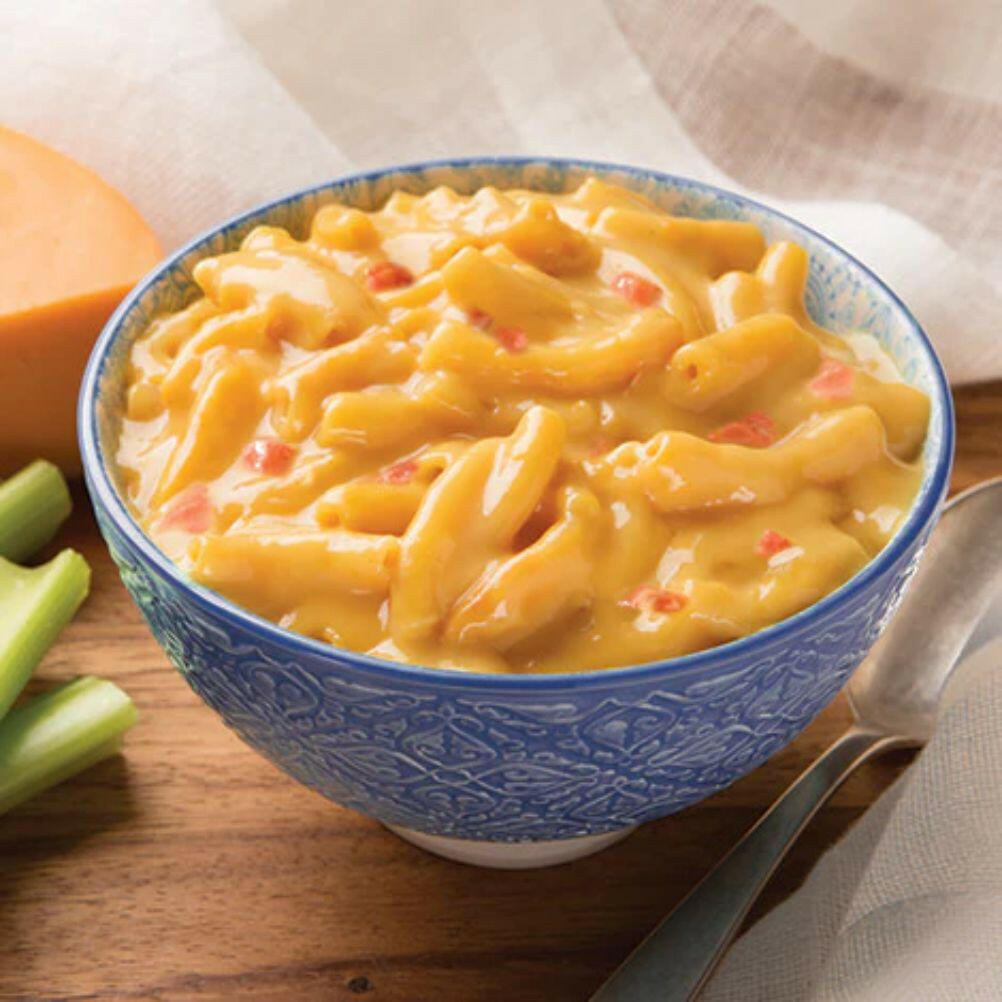 Pâtes [farine de blé dur (blé), niacine, sulfate ferreux (fer), mononitrate de thiamine, riboflavine et acide folique], fromages cheddar et parmesan [(lait pasteurisé cultivé et lait partiellement écrémé, sel, enzymes, cultures de fromage), lactosérum, matières solides de babeurre, sel, phosphate disodique, acide lactique], caséinate de calcium, arômes naturels, chips de bacon d'imitation (farine de soja, huile de soja avec TBHQ ajouté pour protéger la fraîcheur, sel, moins de 2 pour cent de : protéines de soja hydrolysées, extrait de levure, arôme naturel de fumée, huile de tournesol, sucre, chlorure de potassium, dextrose, levure séchée inactive, colorant caramel, FD&C rouge n° 3, protéines de maïs hydrolysées, lécithine de soja, arôme naturel), amidon de maïs modifié, arôme naturel de fromage, poudre d'ail, mélange de gomme (acacia, Guar, xanthane, citrate de potassium, isolat de protéines de lait, extrait de levure, acide citrique, sel, poudre de rocou (pour la couleur), poudre de curcuma (pour la couleur), lécithine de tournesol et/ou lécithine de soja.