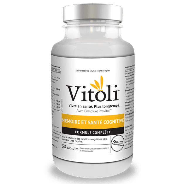 Aide à améliorer les fonctions cognitives chez l’adulte. Aide à améliorer la mémoire chez l’adulte. Aide à prévenir une carence en vitamine B12 ou en vitamine D. Fournit des antioxydants. Il est recommandé de prendre VITOLIMD MÉMOIRE ET SANTÉ COGNITIVE afin d’améliorer votre santé cognitive : prévenir la perte de mémoire et prévenir les troubles cognitifs. Ce produit convient parfaitement à un usage sporadique, par exemple, pour améliorer la mémoire, de même qu’à un usage de prévention afin de conserver vos capacités cognitives en vieillissant. VITOLIMD MÉMOIRE ET SANTÉ COGNITIVE est composé d’une dose clinique d’un extrait concentré de ginkgo biloba, des vitamines B9, B12 et D3, et du Complexe ProvitolMD. ProvitolMD est issu d’une technologie brevetée. Chaque capsule contient des ingrédients normalisés : Provitol, extrait d’olive(Olea europaea, fruit)……………………………50 mg(normalisé à 12 % d’hydroxytyrosol;80 : 1 équivalent à 4 gr d’olives sélectionnées).Ginkgo biloba(Feuille)……………………………………………200 mg(24 % flavoglycosides, 6 % terpéno-lactones ;50 : 1 équivalent à 10 gr de feuilles séchées).Acide folique (Folate)……….…………………400 μgVitamine B12…………………………………….400 μgVitamine D3………………………………………..25 μg Ingrédients non médicinaux : Cellulose microcristalline,Stéarate de magnésium Posologie – Adultes : Prendre une capsule, une fois par jour. Garder hors de la portée des enfants.