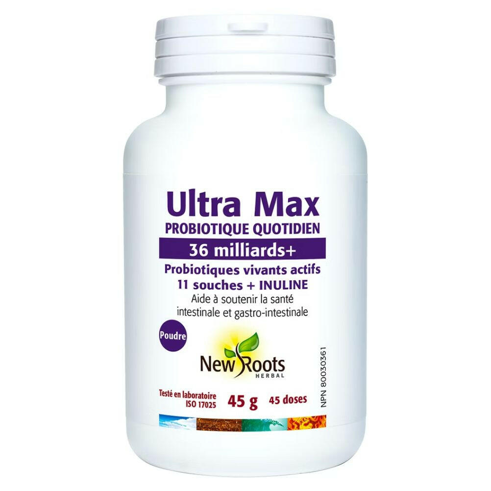 La poudre Ultra Max de New Roots Herbal est un mélange de 11 souches probiotiques conçu pour soutenir la restauration de la flore intestinale. Ce complément probiotique quotidien offre une formule puissante contenant 36 milliards d'unités formant des colonies actives sous forme de poudre pratique pour les personnes qui pourraient avoir des difficultés à avaler des comprimés. La supplémentation en probiotiques est essentielle après un traitement antibiotique car elle contribue à rétablir la flore intestinale perturbée par les antibiotiques et à maintenir l'équilibre bactérien dans le tube digestif humain. Ultra Max combine 11 souches efficaces qui travaillent en synergie pour fournir des bienfaits à différents sites cruciaux le long du tractus intestinal.