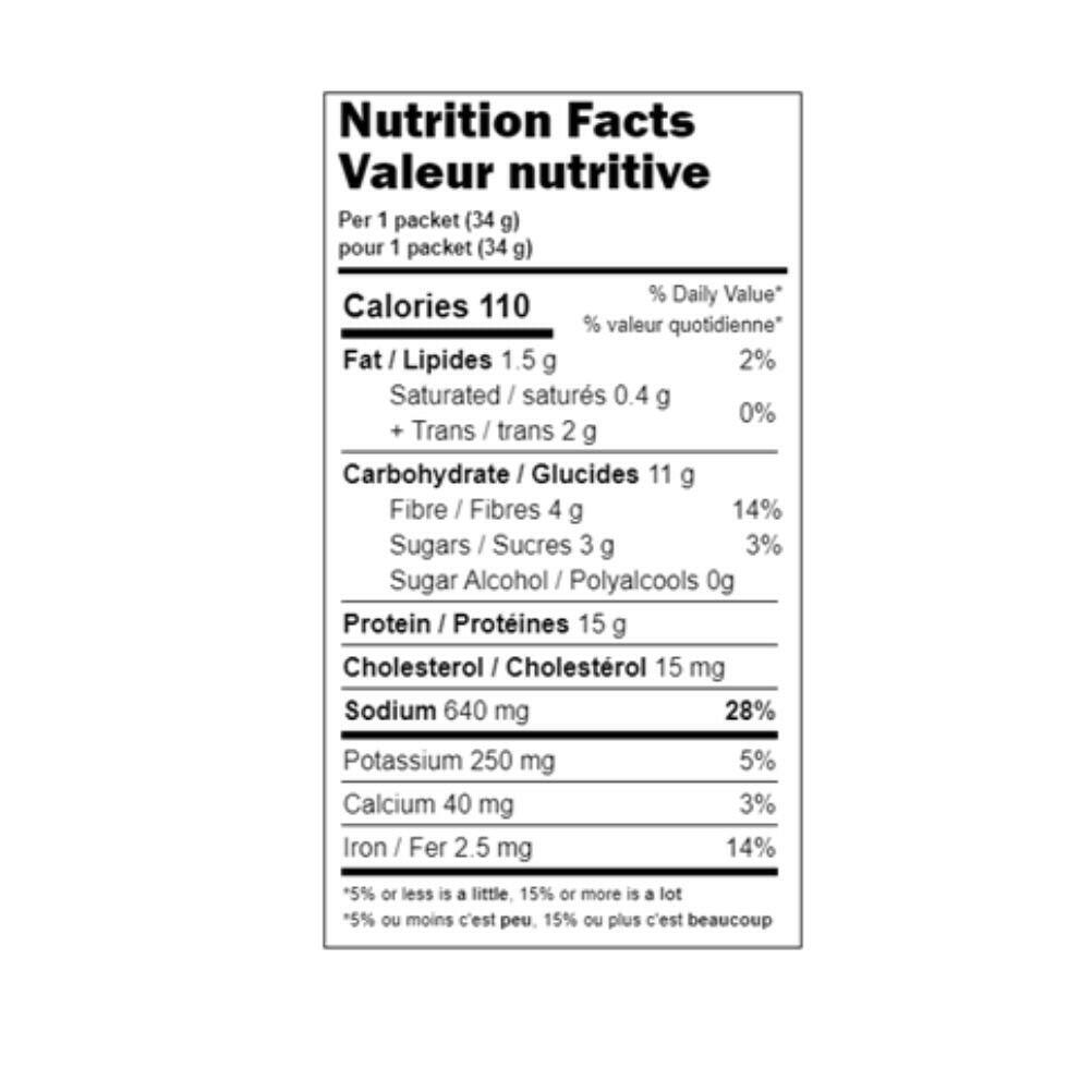 Spaghetti (isolat de protéine de pois, isolat de protéine de blé, amidon de blé modifié, inuline, jaunes d'oeuf en poudre, phosphate de sodium, acide lactique), Protéine texturée de pois et de riz brun, Farine de soja, Légumes déshydratés (tomate, ail, oignon), Protéine végétale hydrolysée (maïs, soja, blé, huile de carthame), Sucres (sucre, maltodextrine), Extrait de levure, Sel, Huile (canola, tournesol), Levure sèche, Arômes naturels, Épices, Acide citrique, Rouge de betterave (colorant), Silicate de calcium, Gomme xanthan gum, Dioxyde de silicium.