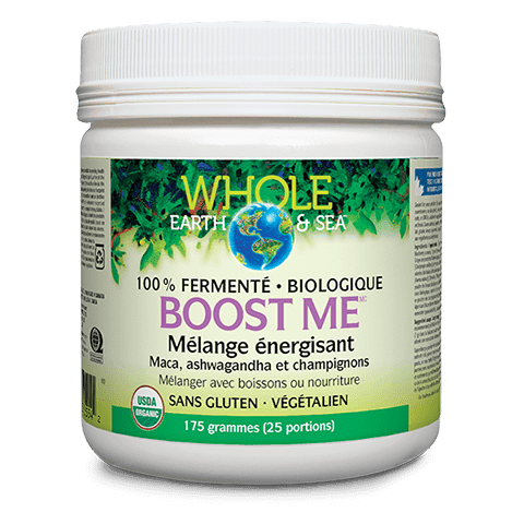 Le mélange énergisant Boost Me de la gamme Whole Earth & Sea contient de la racine de maca et de l’ashwagandha biologiques fermentés dans un mélange adaptogène harmonisant qui favorise l’équilibre, l’énergie et le calme. Cette préparation complète comprend également des bleuets, de l’açaï et des baies de cassis biologiques, ainsi qu’un mélange de champignons biologiques pour vous permettre de rester calme, dynamique et concentré tout au long de la journée.